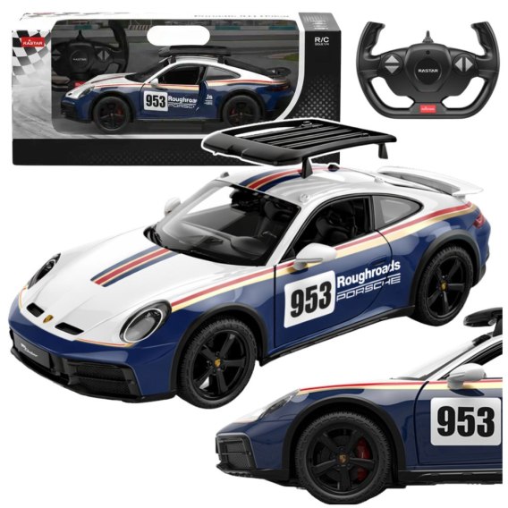 Model RASTAR Porsche 911 Dakar w skali 1:14 to wyjątkowa propozycja dla miłośników motoryzacji, dynamicznej zabawy oraz zdalnie sterowanych pojazdów. Jest to licencjonowana replika kultowego modelu Porsche, która łączy sportowy charakter z terenowym stylem, nawiązując do legendarnego Porsche 953.