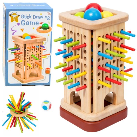 Drewniana Gra Zręcznościowa Edukacyjna Wieża Patyczki Kulki Kostka 37 el. LEAN Toys