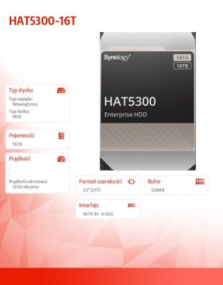 Dyski pamięci masowej klasy korporacyjnej dla systemów Synology Dysk twardy (HDD) Synology HAT5300 oferuje najlepszą w swojej klasie wydajność dzięki ścisłej integr...