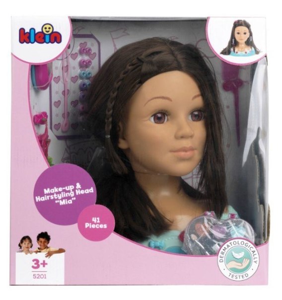 Uwaga, królowie stylizacji i królowe piękności uwolnijcie swoją kreatywność! Ta śliczna głowa oferuje nieograniczone możliwości zabawy z włosami i makijażem: Sięgające ramion blond włosy tej ślicznej głowy fryzjerskiej można myć, czesać, szczotkować i ozdabiać spinkami, koralikami i kolorowymi pasemkami według uznania. Przyjazna buzia czeka tylko na ozdobienie błyszczykiem, cieniem do powiek i różem. Wszystko, czego potrzebują mali styliści, znajduje się w uroczym pudełku w kształcie serca. Theo Klein poddał kosmetyki dla dzieci dokładnej kontroli dermatologicznej, dzięki czemu można je stosować nie tylko na wytrzymałej, zmywalnej lalce, ale także na delikatnej skórze dzieci.