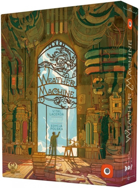 Weather Machine to zaawansowana gra planszowa zaprojektowana przez Vitala Lacerdę (On Mars, Kanban EV), w której gracze wcielają się w role naukowców starających się poprawić działanie generatora pogody stworzonego przez genialnego profesora Lativa. Generator miał za zadanie utrzymywanie idealnej pogody na świecie - farmy potrzebują czasami deszczu, a w kurortach powinno wiecznie świecić słońce. Jednak okazał się maszyną niedoskonałą - jego działanie zakłóca pogodę w innych miejscach na świecie. Celem naukowców jest prowadzenie eksperymentów i badań nad pogodą, publikowanie prac naukowych, dzięki którym uda się udoskonalić maszynę, a może nawet otrzymać za to Nagrodę Nobla. Podobnie jak w poprzednich grach duetu Vital Lacerda i Ian O'Toole, tak i tutaj zetkniecie się z artystycznym dziełem sztuki. Duża kolorowa plansza, kilkadziesiąt customowych meepli robotów, a do tego drewniane tokeny ksiąg, które zastąpiły zwykłe tekturowe żetony.