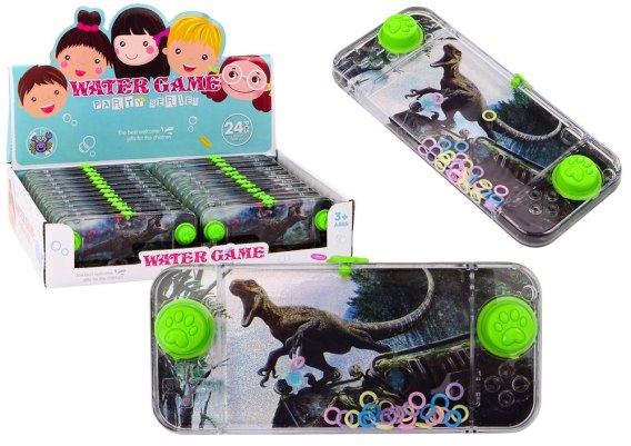 To klasyczna wodna gra zręcznościowa z motywem dinozaura, często spotykana w formie niewielkiej, prostokątnej zabawki. Jej mechanizm jest prosty, ale bardzo wciągający. Gra ma kształt prostokąta, co sprawia, że jest wygodna do trzymania w dłoniach. Po prawej i lewej stronie urządzenia znajdują się dwa zielone przyciski, są kluczowe do gry i są łatwo dostępne dla palców gracza. W środku gry, w przezroczystym zbiorniku wypełnionym wodą, znajdują się kolorowe obręcze. Są one swobodnie unoszące się wewnątrz cieczy. W dolnej części gry wystają dwa szpice, na które należy nadziać obręcze. Szpice te są celami, do których gracz musi trafić obręczami.