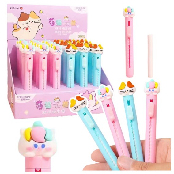 Wysuwana gumka do mazania z uroczą figurką kotka to praktyczny i estetyczny dodatek do szkolnego zestawu każdego dziecka. Pastelowe kolory, zabawna forma i miękka gumka zatopiona w piasku sprawiają, że produkt jest funkcjonalny.
