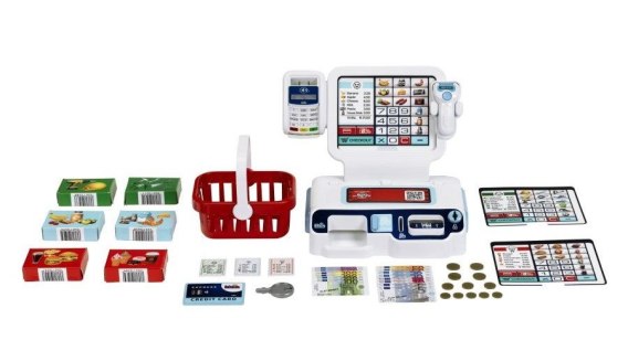 Kasa samoobsługowa zamienia sklep Twojego dziecka w nowoczesny supermarket, sklep samoobsługowy lub restaurację! Wystarczy wyposażyć zabawkowe stanowisko kasowe w odpowiednie urządzenie, włączyć je i gotowe. Klienci biorą to, czego chcą z półek, wkładają zakupy do koszyka i idą do kasy. Tam towary są wprowadzane na klawiaturze lub skanowane z charakterystycznym sygnałem dźwiękowym. Jeśli wśród nich znajdują się paczki Kleina, skaner rozpoznaje ich kod, a praca z kasą jest jeszcze płynniejsza. Pieniądze na zapłacenie za wszystko są na wyposażeniu zabawki. Są tam zarówno monety i banknoty, które można włożyć do kasy i wyjąć, a gdy zabawa się skończy, po prostu zamknij kasę, wyłącz ją i czekaj na następne zakupy. Zasilana bateryjnie ekspresowa kasa do pokoju Twojego dziecka sprawi radość małym klientom chcącym bawić się w sklep. Zabawkę można włączać i wyłączać za pomocą przełącznika, a dzięki podświetlanemu wyświetlaczowi i trzem wymiennym ekranom może ona przekształcić się w sklep samoobsługowy, restaurację lub klasyczny supermarket. Oprócz skanera ze światłem i dźwiękiem oraz klawiatury z funkcją dźwięku, na wyposażeniu znajdują się jeszcze zabawkowe pieniądze, koszyk na zakupy i miniaturowe pudełka, które sprawiają, że każdy zakup staje się niezapomnianym przeżyciem. Ta nowoczesna kasa zachęca dzieci do wzięcia udziału w zabawie polegającej na odgrywaniu ról, która rozwija wyobraźnię i umiejętności komunikacyjne.