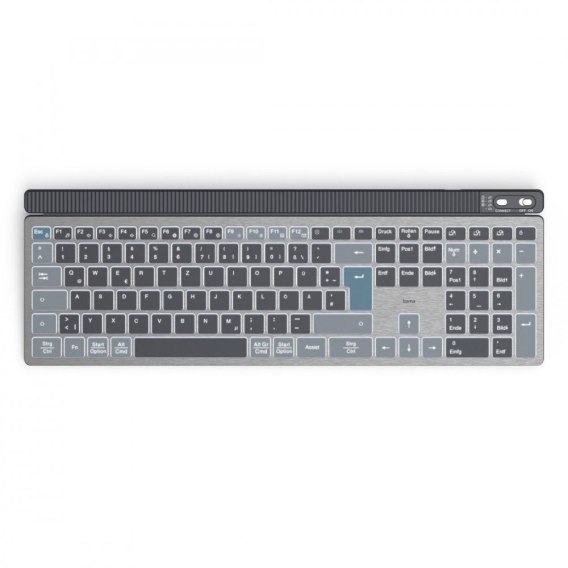 Klawiatura bezprzewodowa Hama WK-750 oferuje wszechstronną łączność multi-device, umożliwiając jednoczesne podłączenie do trzech urządzeń (1 USB, 2 Bluetooth) i szybkie przełączanie między nimi za pomocą przycisku. Stabilne połączenie 2,4 GHz oraz Bluetooth 5.2 zapewnia swobodę użytkowania na odległość do 10 metrów.
