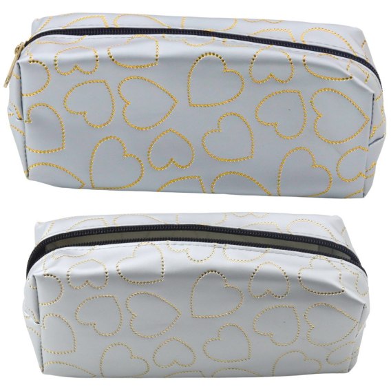 Stylowy i funkcjonalny piórnik w eleganckim srebrnym kolorze, ozdobiony subtelnym wzorem złotych serc, to doskonały wybór dla uczniów, studentów i każdego, kto ceni praktyczne dodatki z modnym akcentem.