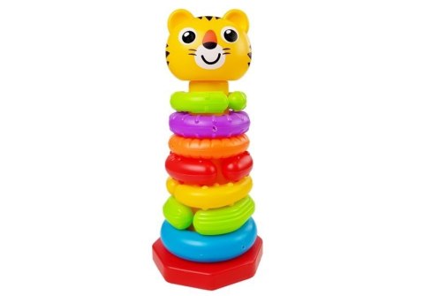 Piramidka w kolorach tęczy jest zabawką, która doskonale wpływa na rozwój maluszka. Składa się z obręczy w różnych kolorach i kształtach. Na szczycie zabawki znajduje najmniejszy kubeczek z nadrukiem tygryska. Obręcze wykonane są z bezpiecznego, nietoksycznego materiału, który odznacza się solidnością i wytrzymałością. Piramidka ma bardzo opływowy, zaokrąglony kształt, co wpływa na poziom bezpieczeństwa płynący z korzystania z przedmiotu.