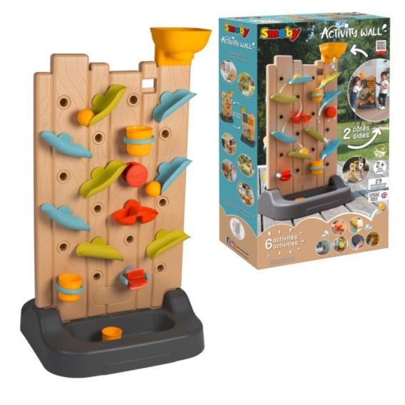 Dwustronna ścianka z aktywnościami dla dzieci wspomagającymi zdolności motoryczne i zręcznościowe. Z jednej strony ścianki zestaw rynienek po których może spływać woda lub piłka a z drugiej strony ścianki dzieci mogą bawić się w grę kółko i krzyżyk, trafiać piłeczkami w różnej wielkości koszyki lub naśladować różne pozy gimnastyczne umieszczone na kole z aktywnościami.
