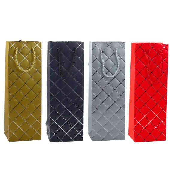 Elegancka torba prezentowa na butelkę to doskonały wybór na każdą okazję. Wykonana z wysokiej jakości papieru, torba charakteryzuje się nowoczesnym i stylowym wzorem w postaci srebrnej kraty, która nadaje jej wyjątkowego szyku. Dzięki metalicznemu połyskowi i geometrycznemu motywowi torba prezentuje się niezwykle efektownie i elegancko.