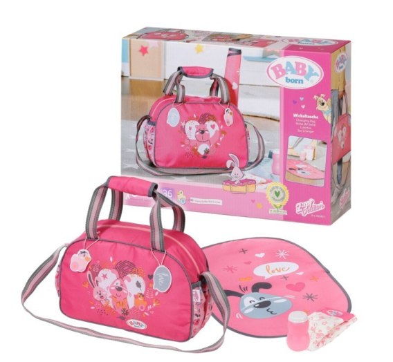BABY born cieszy się na każde wyjście, podobnie jak jej przyjaciele - zwierzątka, których wizerunki widnieją na przewijaku. Uuuups z tej ekscytacji właśnie zrobiła siusiu. Jakie to szczęście, że pod ręką zawsze jest przewijak. Jet w nim wszystko, czego potrzebuje dziecko: mata do przewijania, pieluszka i pojemnik z pudrem. Jest także miejsce na butelkę z napojem, rozkład jazdy autobusów i zebrane po drodze skarby. Przewijak można komfortowo przenosić trzymając w ręku lub wieszając na ramieniu. Do pasków doczepiono urocze zawieszki, którymi BABY born może się bawić podczas przewijania.