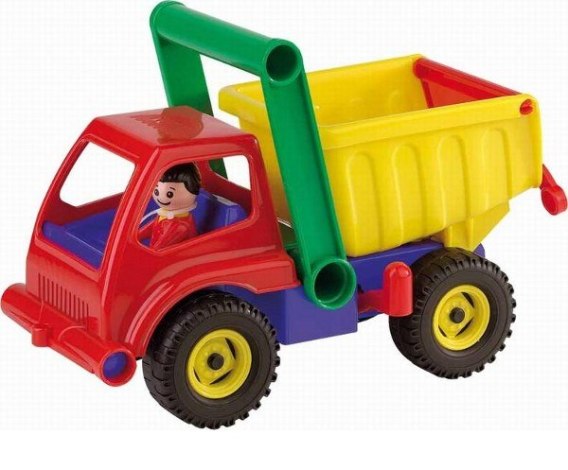 Super kolorowa wywrotka z wysokimi burtami. Pojazd posiada 2 osie i blokadę naczepy. Ponad kabiną znajduje się rączka do wygodnego sterowania pojazdem. W kabinie jest figurka kierowcy. Pojazd ma 27 cm długości.