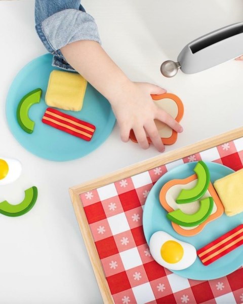 - Zestaw zawiera 16 elementów: toster, 2 talerze, 2 kromki chleba, 2 masła, 4 plastry awokado, 2 jajka, 2 paski bekonu, tacę do serwowania