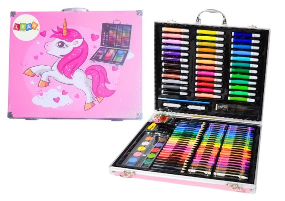 Cały zestaw jest zapakowany w elegancką, różową walizkę, która przyciąga wzrok swoim żywym kolorem. Walizka dodatkowo ozdobiona jest motywem jednorożca, co nadaje jej magicznego charakteru i z pewnością przypadnie do gustu każdemu dziecku. Motyw jednorożca wprowadza element fantazji, zachęcając do kreatywnej zabawy i tworzenia.