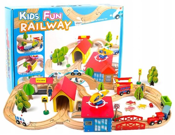 DREWNIANY TOR KOLEJKA AUTKA DRZEWA BUDYNKI ZESTAW 69 ELEMENTÓW