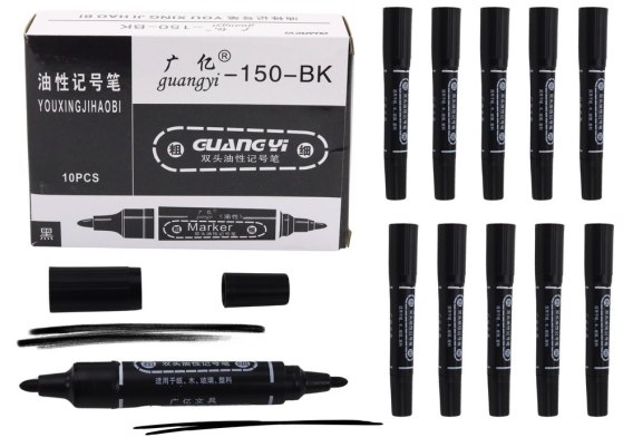 Zestaw 10 czarnych markerów dwustronnych, wodoodpornych, idealny do trwałego pisania na papierze, plastiku, metalu czy szkle. Zapewniają wyraźne oznaczenia, odporne na wodę. Wygodny, okrągły kształt sprawia, że są idealne do codziennych zastosowań.