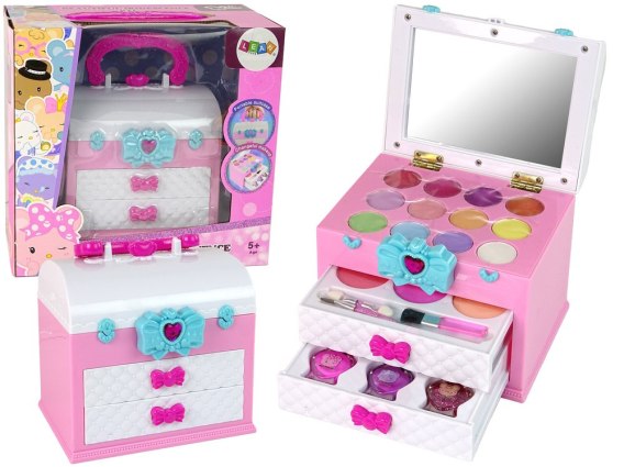 Walizka ma dwie wysuwane szufladki, które są ozdobione delikatną różową kokardką, nadając całości uroku i dziewczęcego wdzięku. W pierwszej, znajdują się 3 cienie do powiek oraz 3 pędzelki, które pozwolą małym artystkom na tworzenie różnorodnych makijaży i eksperymentowanie z kolorami.