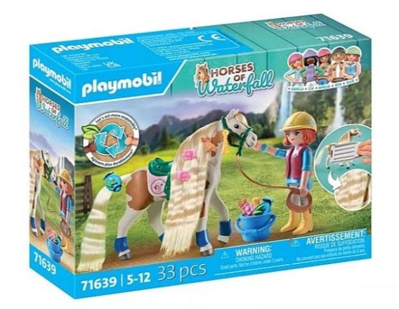 Ellie uwielbia ozdabiać grzywę i ogon swojego ukochanego konia Pinto pięknymi dodatkami. Zanim zabierze wałacha Paint Horse na przejażdżkę, czeka go specjalna atrakcja: stylizacja włosów za pomocą falownicy, która również znajduje się w zestawie. Dzięki karbowanej grzywie Pinto jest nową gwiazdą Rancza Waterfall!